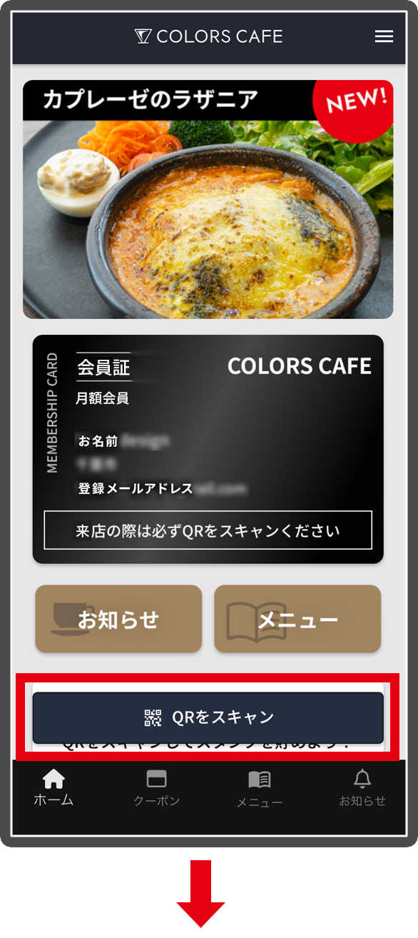 会員登録をすると、会員アプリのトップ画面に月額会員証とお名前が表示されます。